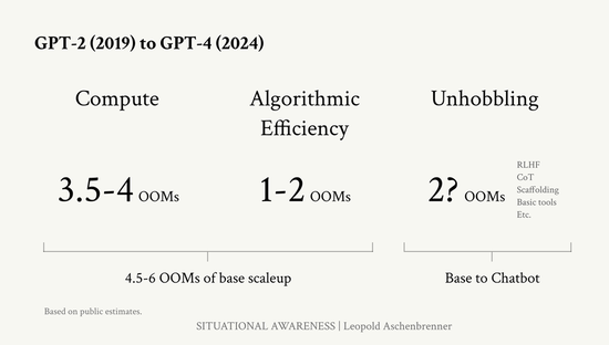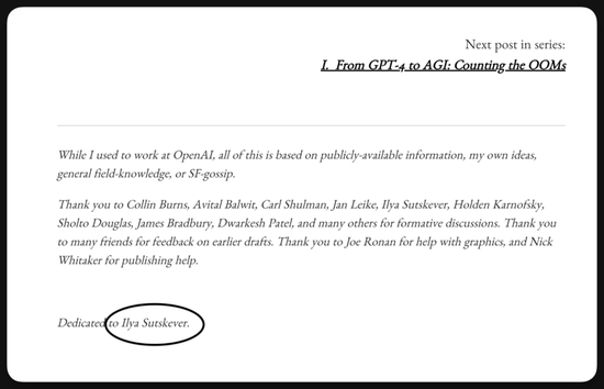 不过,被解雇的挫折并未击倒Aschenbrenner,反而让他了两个月的沉淀时间。2024年6月,他发布了长达165页的重磅文章——《态势感知:未来十年》(Situational Awareness: The Decade Ahead)。这篇宏文迅速在科技圈和投资界疯传。有趣的是,在这份报告下面,他还特别致谢了AI圈子里”永远的神“Ilya Sutskever”(OpenAI联合创始人)。