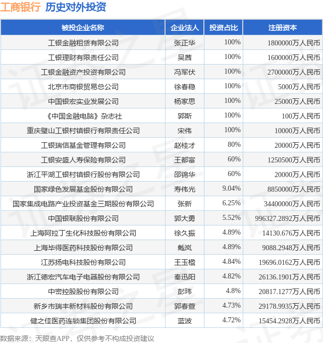 本站消息,根据天眼查APP显示,工商银行(601398.SH)新增一起对外投资事件,被投资公司为上海奥浦迈生物科技股份有限公司,法定代表人肖志华,投资占比为1.31%。该公司从事研究和试验发展安全配资门户,注册资本为11354.8754万人民币。目前,工商银行共存在对外投资1192项,投资占比前20的项目见下表: