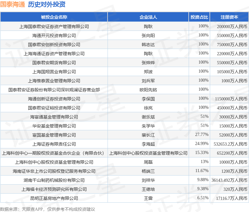 本站消息,根据天眼查APP显示,国泰海通(601211.SH)新增一起对外投资事件,被投资公司为江苏联诚德隆汽车部件股份有限公司配资股票投资,法定代表人周文荣,投资占比为3.58%。该公司从事汽车制造业,注册资本为6301.2万人民币。目前,国泰海通共存在对外投资145项,投资占比前20的项目见下表: